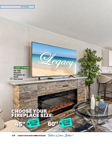 INTERIOR LUXURY UPGRADE 45'' LED Electric Fireplace w/ Rock Surround CHOOSE YOUR FIREPLACE SIZE: $1,499 $1,199 45” STARTING AT 60” STARTING AT ROCK ROCK er ! tt T 108 LEGACY 2024-2025 HOME CATALOG Taller, Wider, Better ! er, Wider, Be all