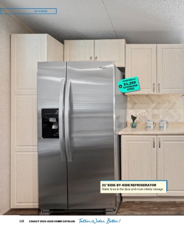 INTERIOR STARTING AT $1,269 STAINLESS STEEL 21’ SIDE-BY-SIDE REFRIGERATOR Water & ice in the door and more interior storage. T 118 LEGACY 2024-2025 HOME CATALOG Taller, Wider, Better ! all er, Wider, Be tt er !