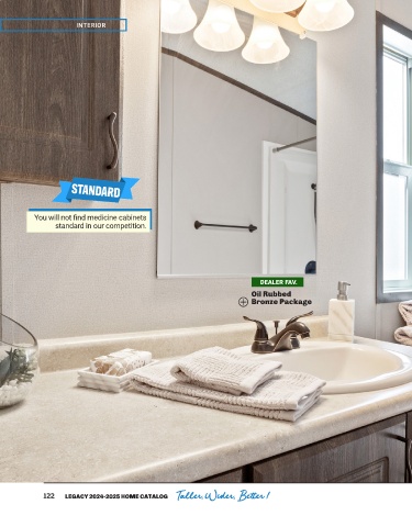INTERIOR You will not find medicine cabinets standard in our competition. DEALER FAV. Oil Rubbed Bronze Package er ! tt T 122 LEGACY 2024-2025 HOME CATALOG Taller, Wider, Better ! er, Wider, Be all
