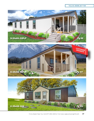 TALLER, WIDER, BETTER! S-24x64-32FLP Pg 56 CUSTOMER FAVORITE S-28x56-32FLP Pg 57 C-32x48-32A Pg 59 Find a Dealer Near You: Call (877) 652-3322 or Visit www.LegacyHousingUSA.com 37