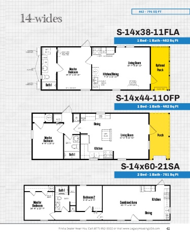 462 - 795 SQ FT 14-wides S-14x38-11FLA 1 Bed - 1 Bath - 462 Sq Ft S-14x44-11OFP 1 Bed - 1 Bath - 462 Sq Ft S-14x60-21SA 2 Bed - 1 Bath - 761 Sq Ft Find a Dealer Near You: Call (877) 652-3322 or Visit www.LegacyHousingUSA.com 41