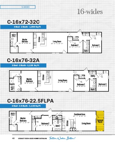 16-WIDES 16-wides C-16x72-32C 3 Bed - 2 Bath - 1,068 Sq Ft C-16x76-32A 3 Bed - 2 Bath - 1,130 Sq Ft C-16x76-22.5FLPA 2 Bed - 2.5 Bath - 1,130 Sq Ft tt er ! er, Wider, Be 46 LEGACY 2024-2025 HOME CATALOG Taller, Wider, Better ! T all