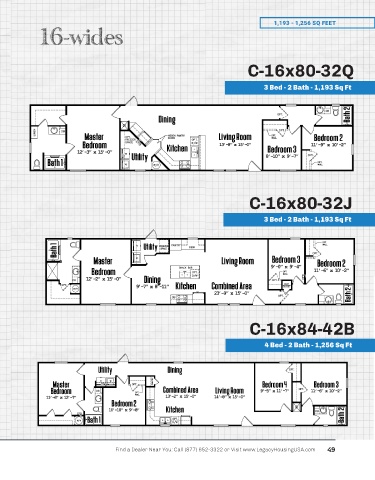 1,193 - 1,256 SQ FEET 16-wides C-16x80-32Q 3 Bed - 2 Bath - 1,193 Sq Ft C-16x80-32J 3 Bed - 2 Bath - 1,193 Sq Ft C-16x84-42B 4 Bed - 2 Bath - 1,256 Sq Ft Find a Dealer Near You: Call (877) 652-3322 or Visit www.LegacyHousingUSA.com 49