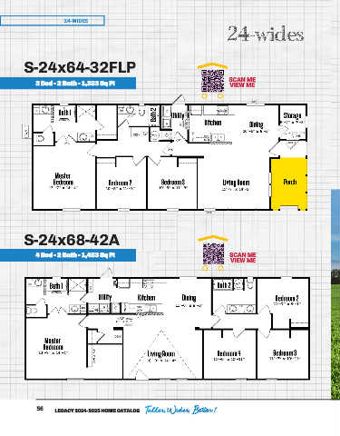 24-WIDES 24-wides S-24x64-32FLP SCAN ME 3 Bed - 2 Bath - 1,383 Sq Ft VIEW ME S-24x68-42A 4 Bed - 2 Bath - 1,483 Sq Ft SCAN ME VIEW ME 56 LEGACY 2024-2025 HOME CATALOG Taller, Wider, Better ! er ! tt T er, Wider, Be all