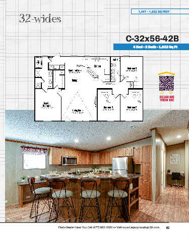 1,497 - 1,622 SQ FEET 32-wides C-32x56-42B 4 Bed - 2 Bath - 1,622 Sq Ft SCAN ME VIEW ME Find a Dealer Near You: Call (877) 652-3322 or Visit www.LegacyHousingUSA.com 61
