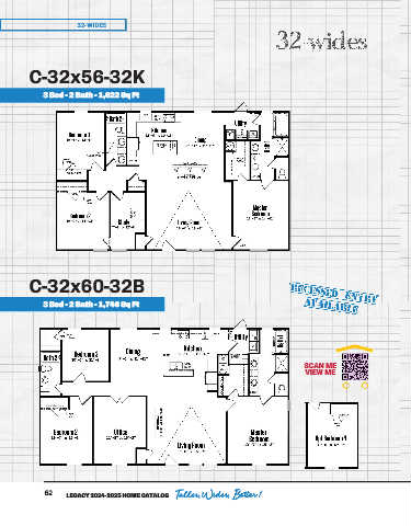 32-WIDES 32-wides C-32x56-32K 3 Bed - 2 Bath - 1,622 Sq Ft C-32x60-32B 3 Bed - 2 Bath - 1,746 Sq Ft SCAN ME VIEW ME 62 LEGACY 2024-2025 HOME CATALOG Taller, Wider, Better ! er ! tt T er, Wider, Be all