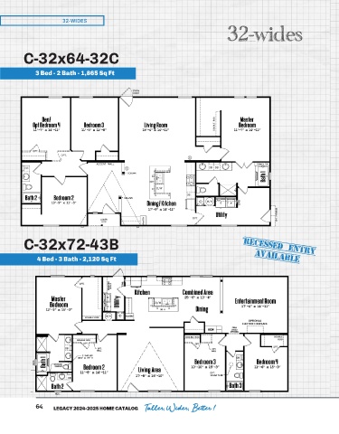 32-WIDES 32-wides C-32x64-32C 3 Bed - 2 Bath - 1,865 Sq Ft C-32x72-43B 4 Bed - 3 Bath - 2,120 Sq Ft 64 LEGACY 2024-2025 HOME CATALOG Taller, Wider, Better ! tt er ! er, Wider, Be T all