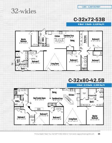 1,865 - 2,369 SQ FEET 32-wides C-32x72-53B 5 Bed - 3 Bath - 2,120 Sq Ft C-32x80-42.5B 4 Bed - 2.5 Bath - 2,369 Sq Ft Find a Dealer Near You: Call (877) 652-3322 or Visit www.LegacyHousingUSA.com 65