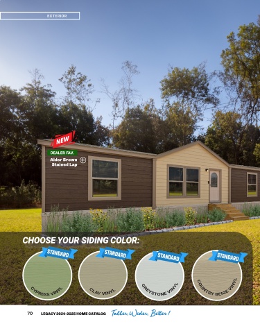 EXTERIOR DEALER FAV. Alder Brown Stained Lap CHOOSE YOUR SIDING COLOR: COUNTRY BEIGE VINYL GREYSTONE VINYL CYPRESS VINYL CLAY VINYL tt er ! 70 LEGACY 2024-2025 HOME CATALOG Taller, Wider, Better ! 70 T all er, Wider, Be