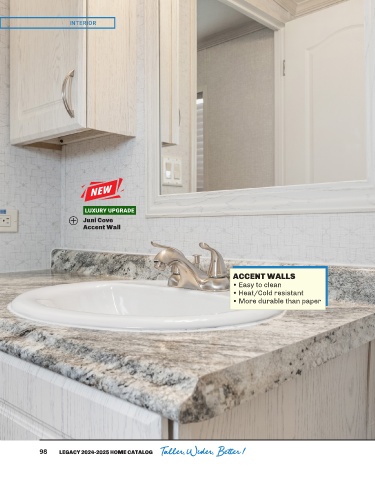 INTERIOR LUXURY UPGRADE Juni Cove Accent Wall ACCENT WALLS • Easy to clean • Heat/Cold resistant • More durable than paper er ! T 98 LEGACY 2024-2025 HOME CATALOG Taller, Wider, Better ! all tt er, Wider, Be